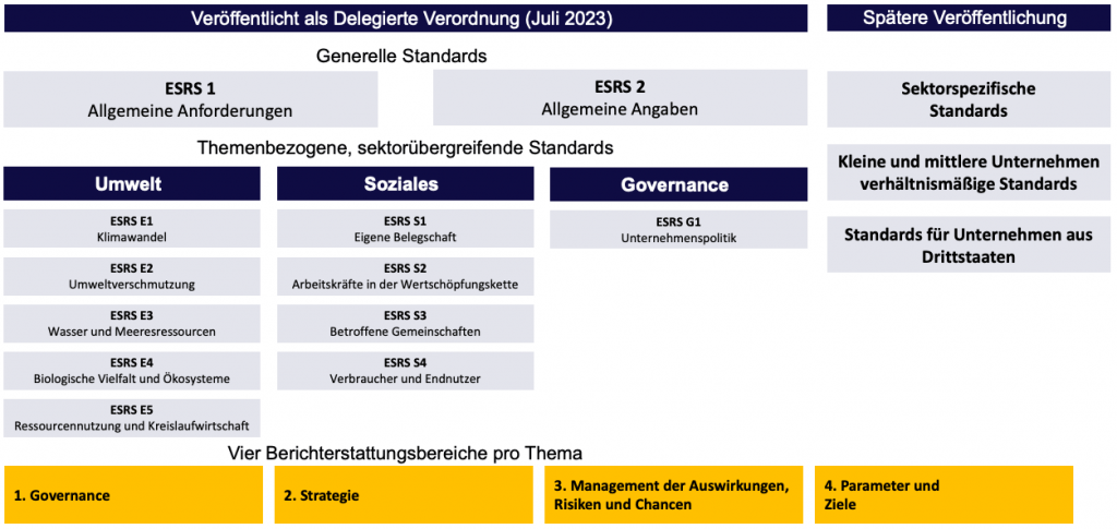 Die von der CSRD-Richtlinie vorgegebenen ESG-Berichtsinhalte (Environmental (Umwelt), Social (Soziales), Governance (Unternehmensführung)), werden durch aktuell 12 European Sustainability Reporting Standards (ESRS) konkretisiert. Bei den ESRS handelt es sich um EU-Verordnungen, die direkt Rechtswirkung entfalten und somit Berichtsinhalte definieren, die von allen Unternehmen umzusetzen sind.